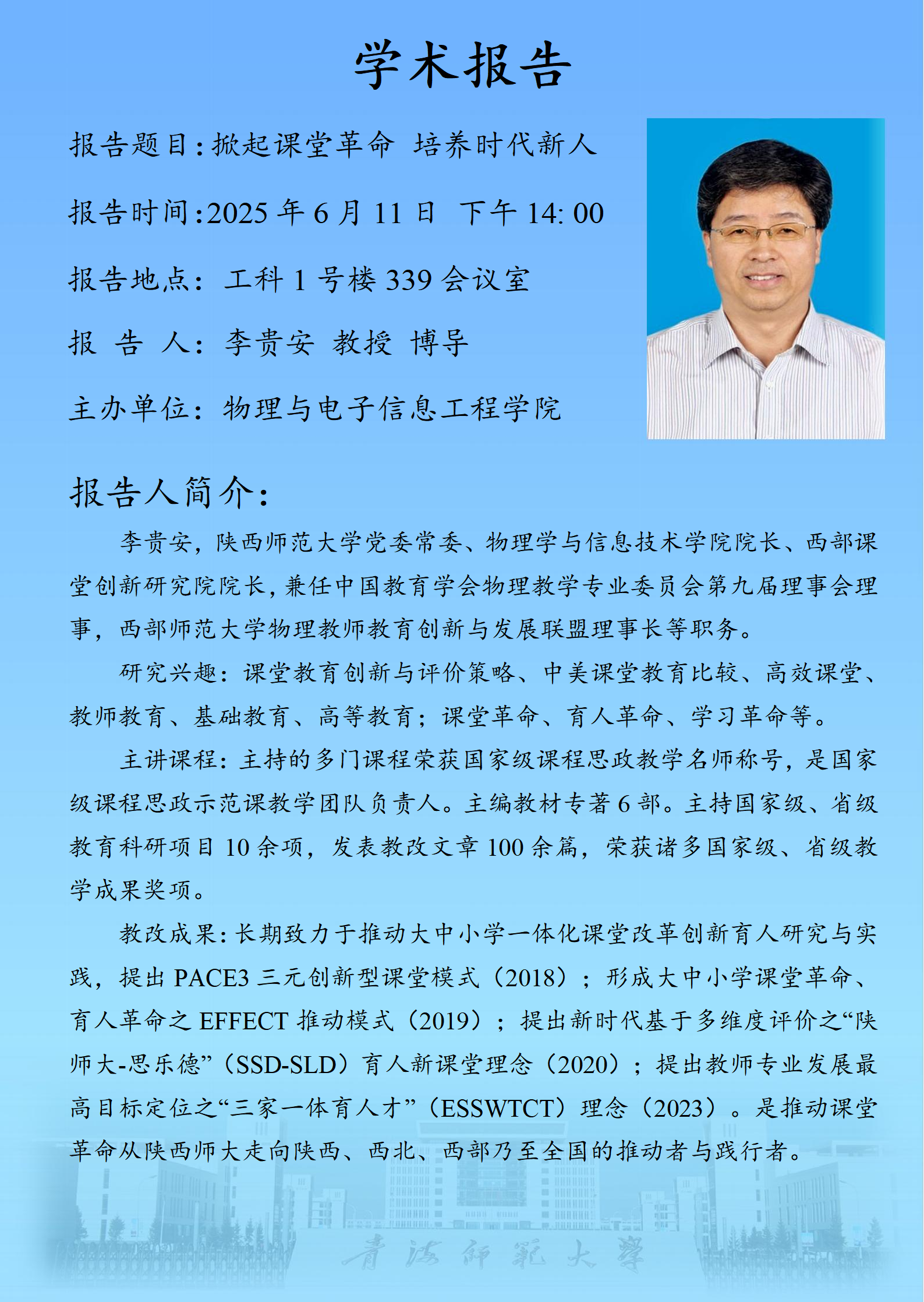 为进一步增进校内外学术交流,拓展校内师生教育教学研究视野,开云体育 定于2025年6月11日(星期三)举办“掀起课堂革命 培养时代新人”为主题的课堂教学讲座,欢迎届时参加交流。